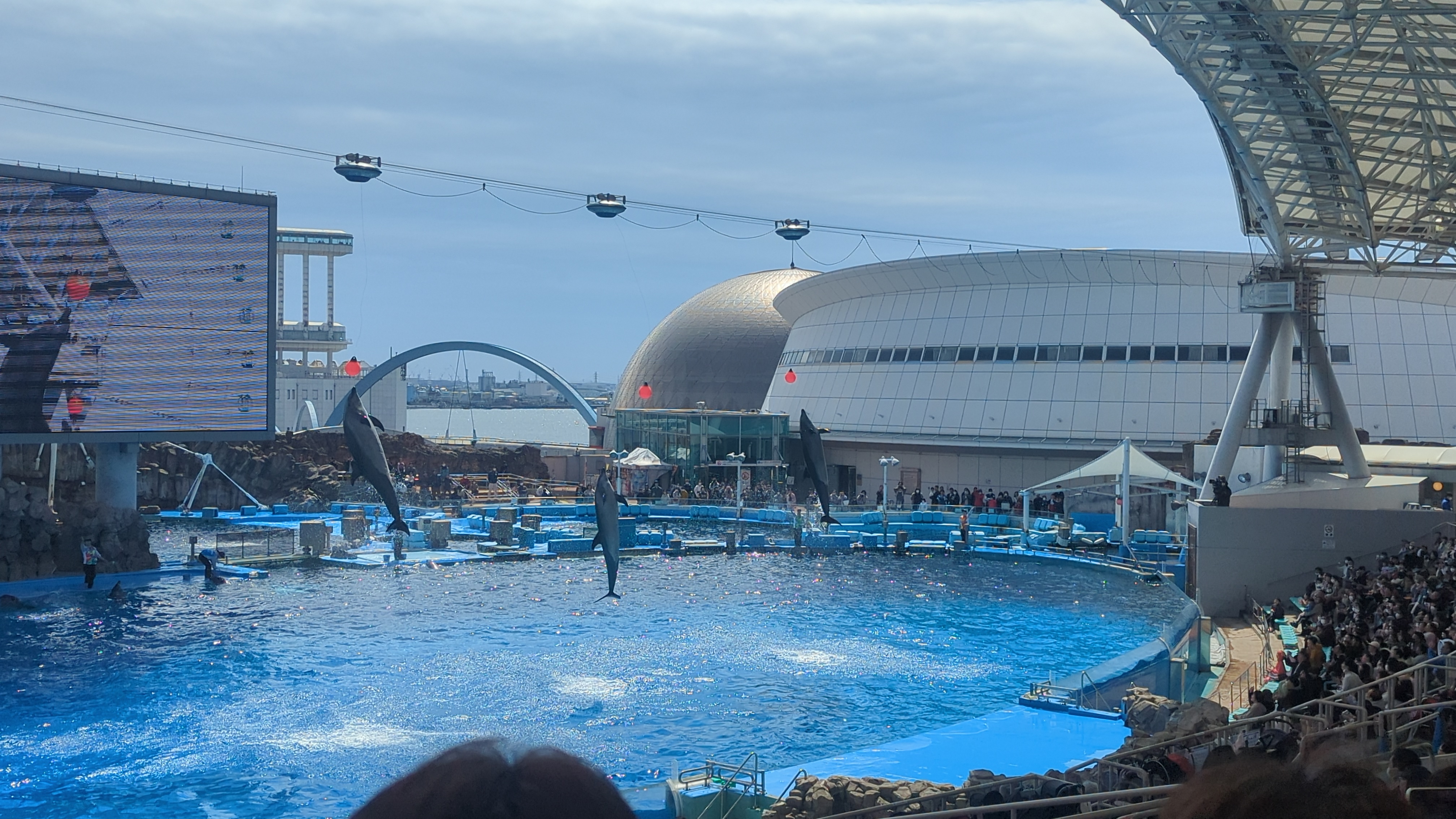 名古屋港水族館のイルカショーはかなり映像に力が入れられていて、ショー開始前の映像や、ショー中のライブ映像などどれもクオリティが高かったです。とくにショー中の映像は複数台のカメラが切り替わって見どころをバッチリ抜いてくれる感じで、ライブの配信を見ている感じでした。