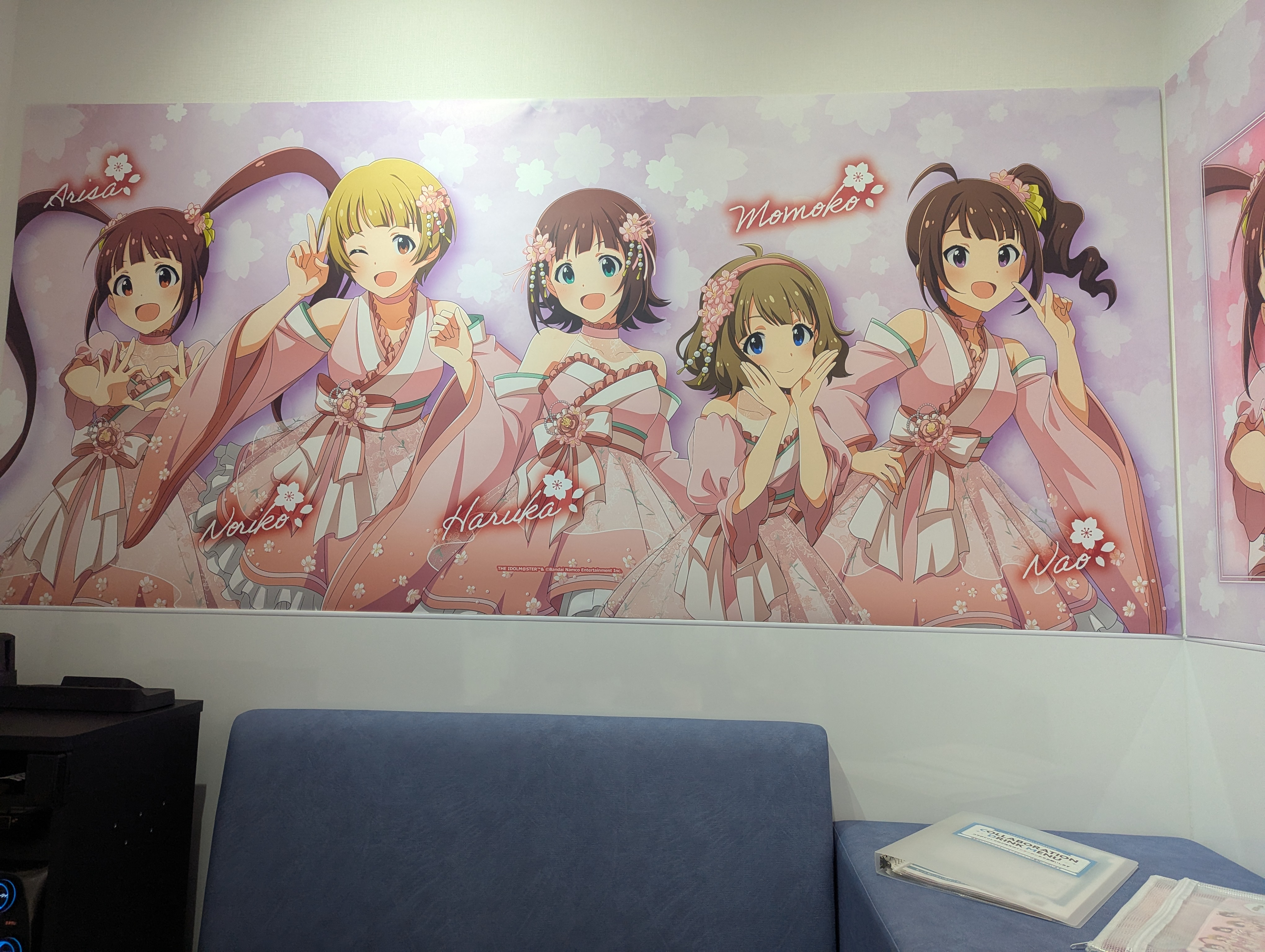 コラボ絵のアクスタ。右下の名前プレート、これ多分コラボドリンクセットについてきたやつなんですが、ランダムなんでしょうかね…?